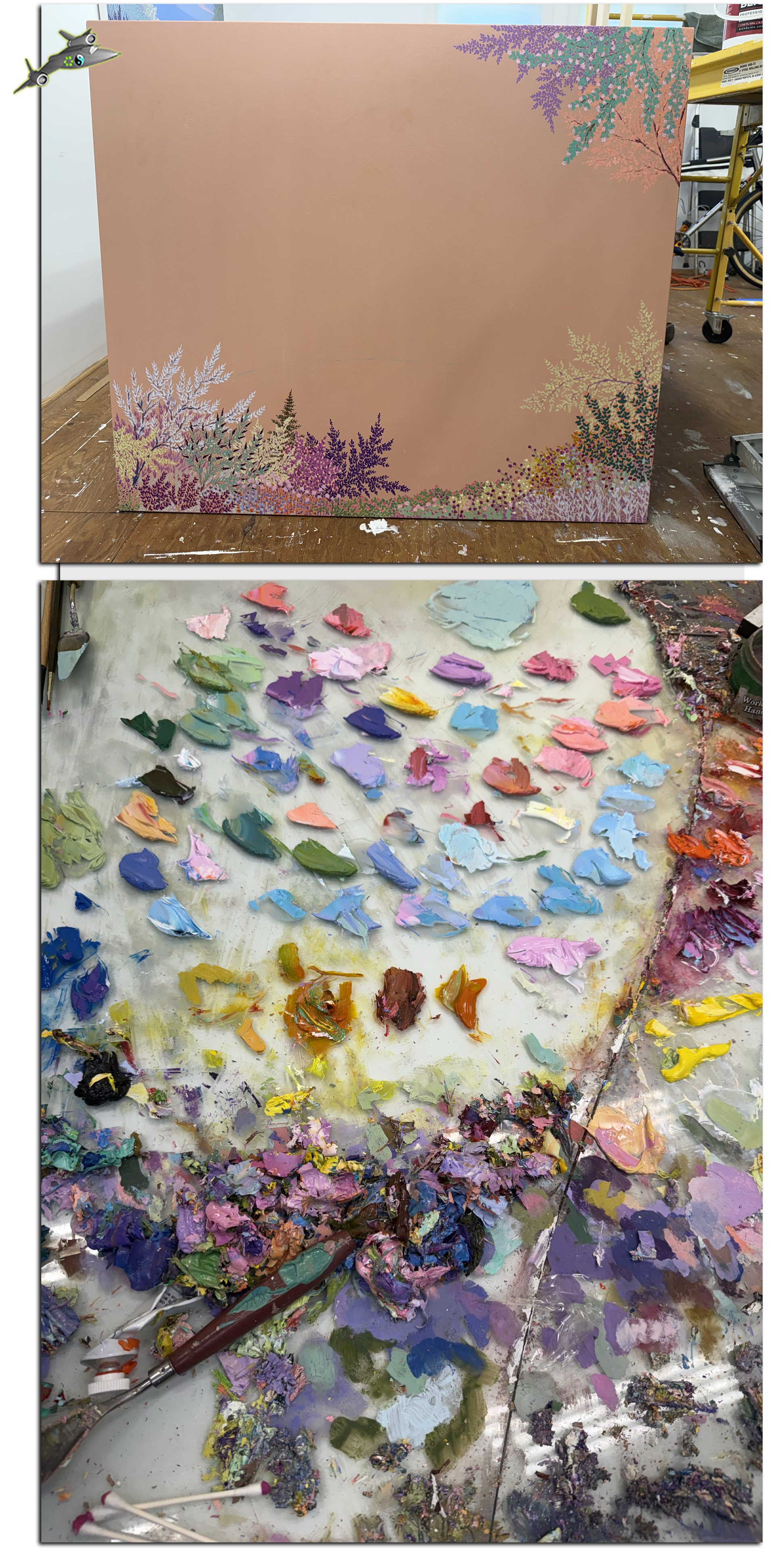 His answer to both questions is, No. “But when I’m making these paintings, and listening to music, I’m often tuning myself, in order to have that kind of euphoria,” he says. “Sometimes what I’m looking for to finish a painting is this moment of euphoria and electricity. I want it to feel slightly disorienting, but beautiful. Which is what a mushroom trip is.”