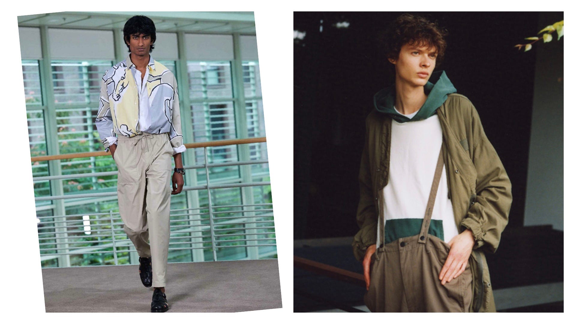 Meanwhile the fit above right, from Visvim FW20, incorporates a couple tuck-boosting elements we’ve already ID’d — the free-flowing outer layer worn over the tucked “Jumbo Hoodie,” and the vertical motion of the suspenders rising up from the “Camus Braces” pants…