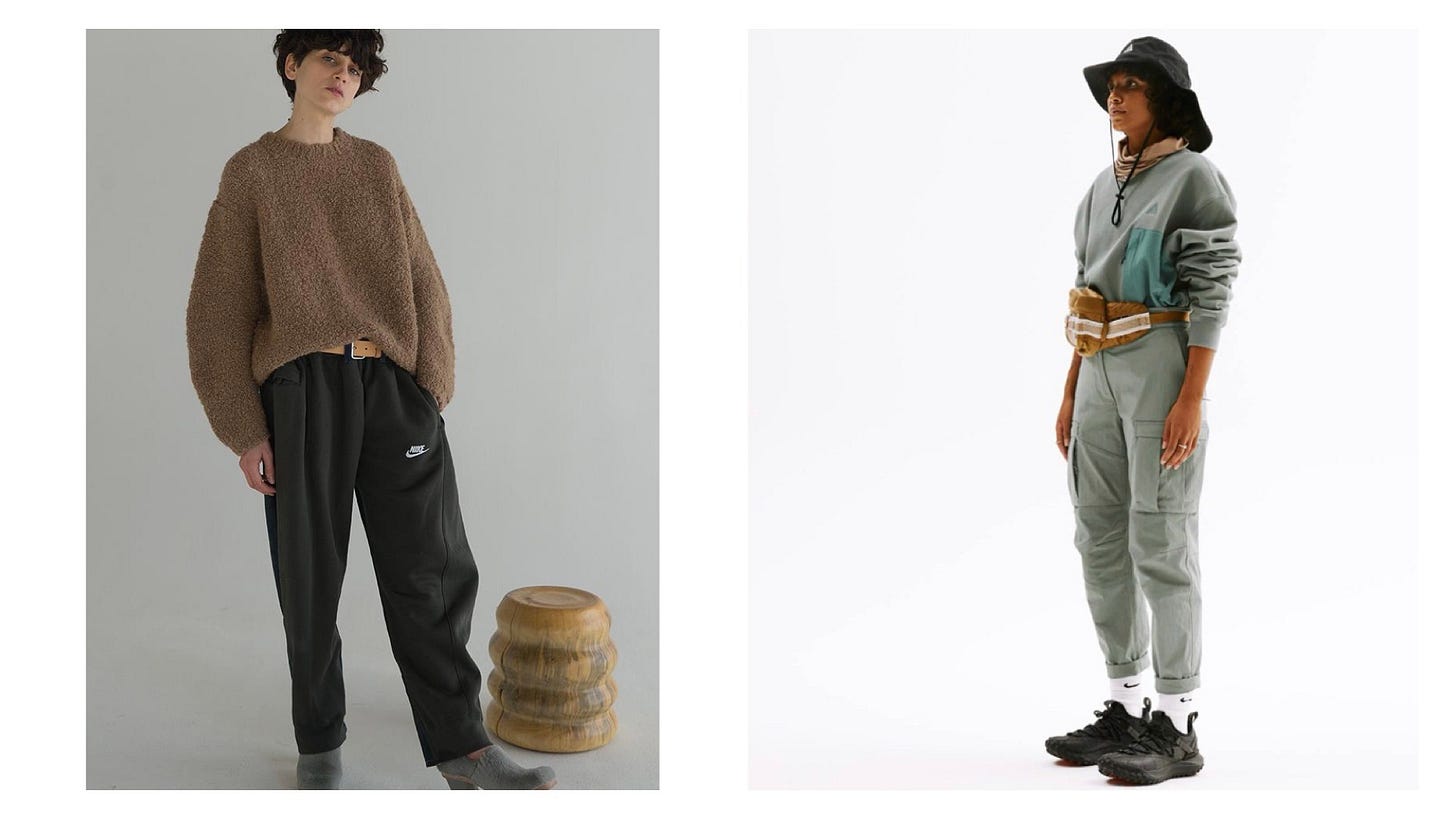 Above right we’ve got a shot from Nike ACG SS21 in which ma TUCKS a baggy sweatshirt and then MASSAGES the Tuck Interface with a strategically deployed fanny pack — this is a GORPY take on the “tuck all tops” mindset that shows the value of accessories besides belts and suspenders when it comes to composing a tuck.