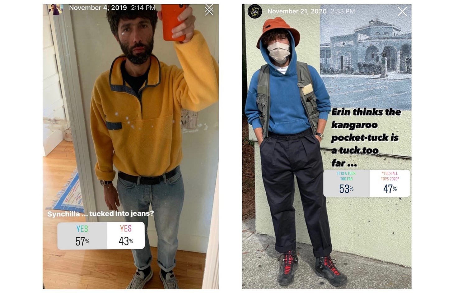 A few weeks back, Spyplane reader Robb McNeill shared the fit above left to his IG stories and @-ed us… Part of what works here is that he’s wearing a 1/2-zip puffer, which I think tucks better than a full-zip joint would, and it’s helped along by the outer layer, which, as in the earlier cases we’ve discussed, simultaneously frames and “takes the edge off” the unconventional tuck.