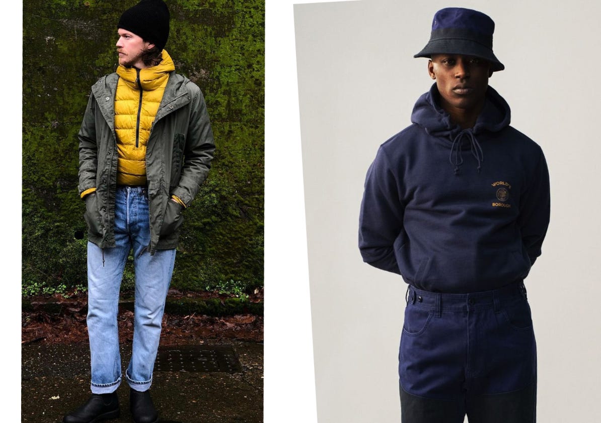A different approach to the tucked hoodie is below right, in an image from Aimé Leon Dore SS21. The full-fit midnight monochrome scheme here is key, because it mutes the “statement” that the bisected kangaroo-pocket makes, and lets the whole fit burn with a minimalist power…