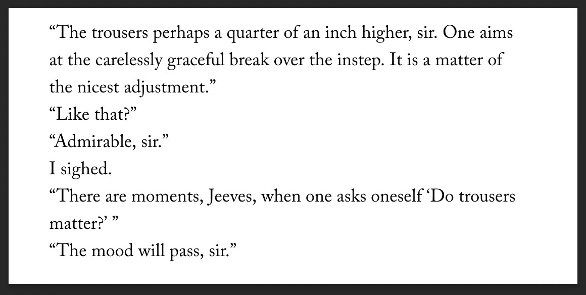 It’s hard to excerpt Wodehouse in a way that communicates the enveloping pleasure of reading him, because, like with many funny writers, the pleasure is an aggregate effect: the more Wodehouse you consume — the more familiar you become with his cadences, his mannerisms, and the small, ridiculous universe he conjures — the exponentially funnier he gets. Doing a recent re-read of Joy in the Morning I was still stonefaced at page 9… but by page 28 ?? Yr boy was “straight guffawing.”
