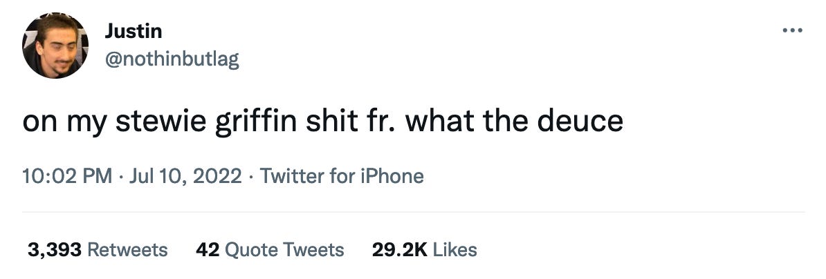 It was a tweet about Stewie Griffin, but “what the deuce” is the kind of thing ppl say all the time in Wodehouse stories, so by the time I saw this tweet I’d seen enough to call it: It’s officially P.G. Wodehouse Summer.
