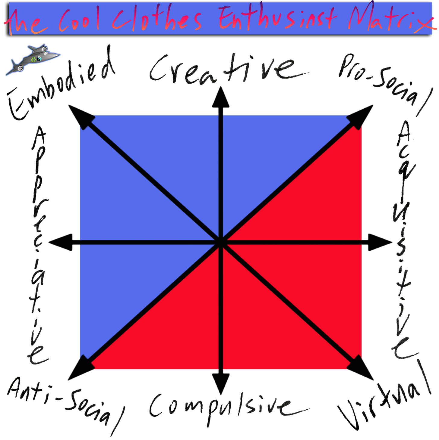 Who is the creative, appreciative, embodied, pro-social Turbo Clothes Enthusiast, occupying the top corner? An admirable real one. She puts together sick, ingenious outfits composed of clothes she knows well, cops judiciously, and loves deeply, and rocks these out in the world among other people while doing cool things that have nothing to do with clothes, including being very neighborly.