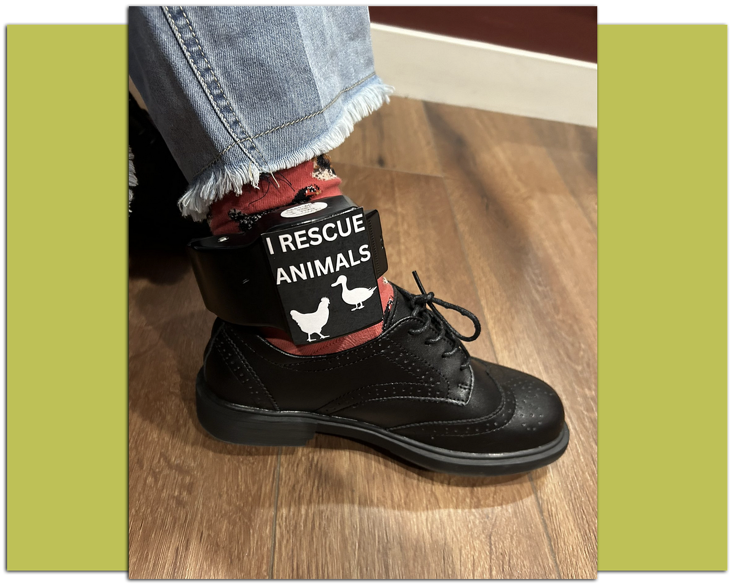 As Rosenberg’s case moves toward trial, she’s been ordered to wear an ankle monitor. She characterizes this as “a daily reminder that the state, industry, and FBI is trying to paint me as a danger to society.” The device is above, which she decorated with a sticker reading “I RESCUE ANIMALS 🐓 🦆”