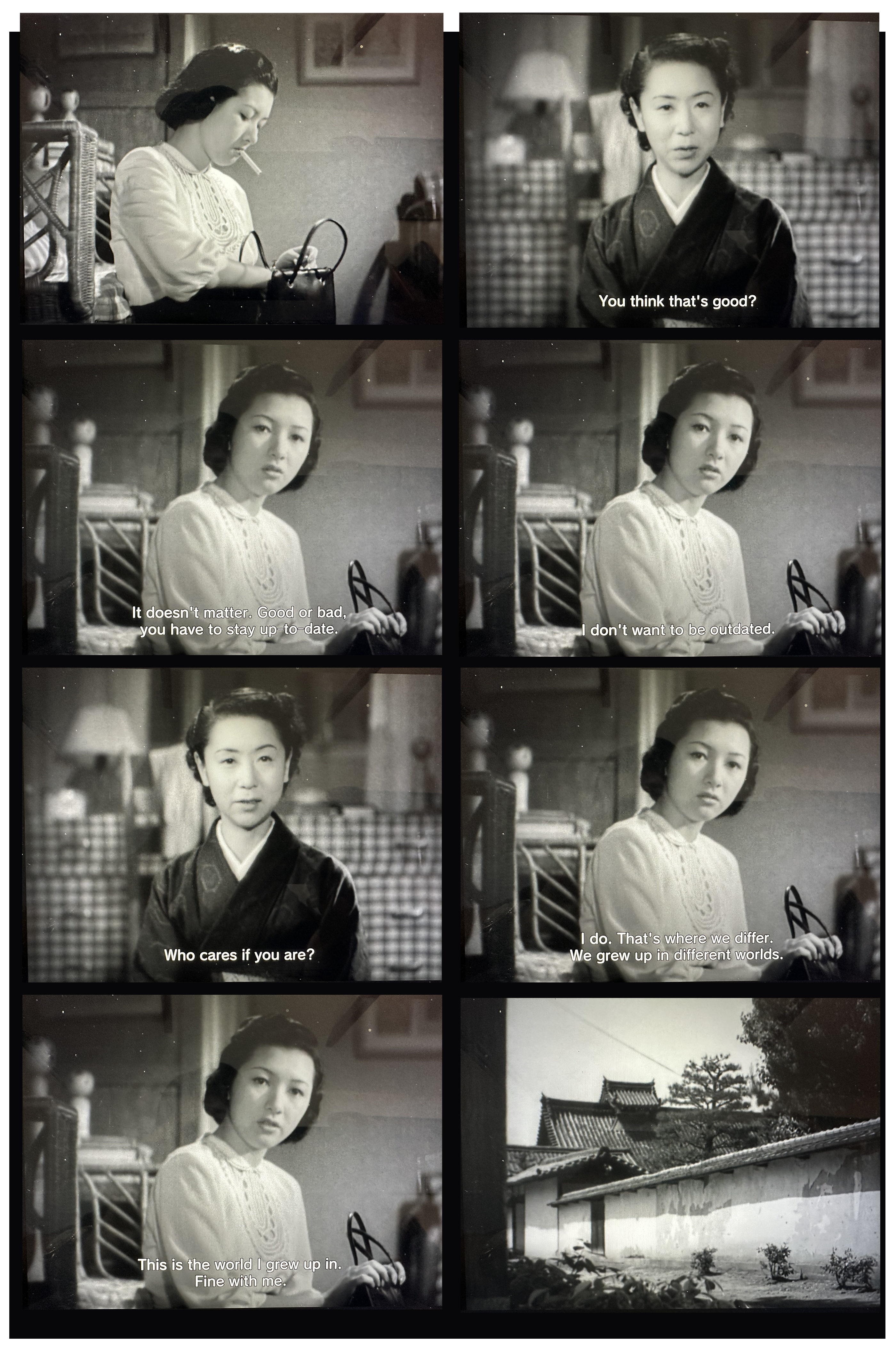 Sometimes storm clouds gather above my big beautiful brain and with a sudden jolt it strikes me that — try as I might to delude myself through elaborate intellectual justifications, and despite co-creating a brilliant newsletter devoted to the principle that cool clothes rock — fashion is dumb and my investment in it is a sickness. The other night was one of those times. We watched a Criterion interview with swag lord and cinematic king Wim Wenders where he shouted out a 1950 feature by Yasujirō Ozu — a major hero in the Spyplane Cinematic Pantheon — called Munekata Sisters. We hadn’t ever seen it, so we threw it on.