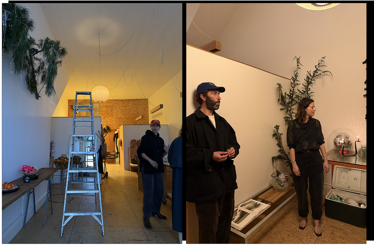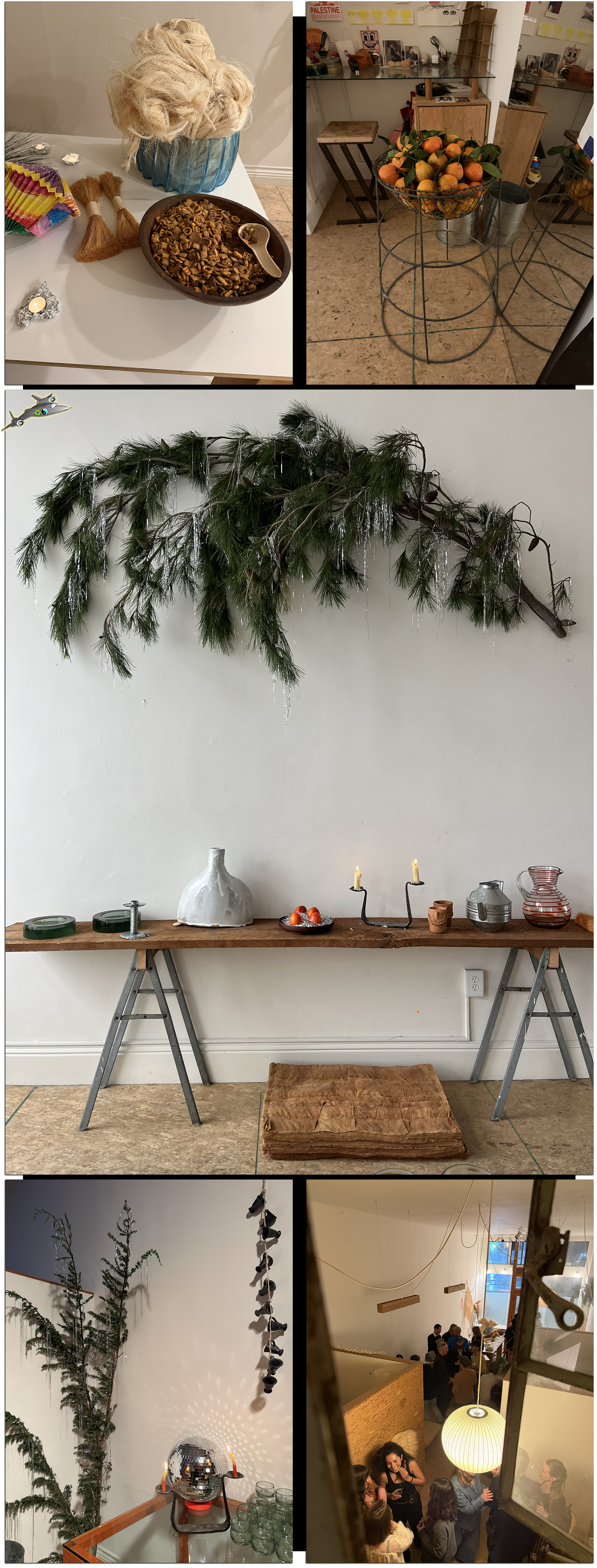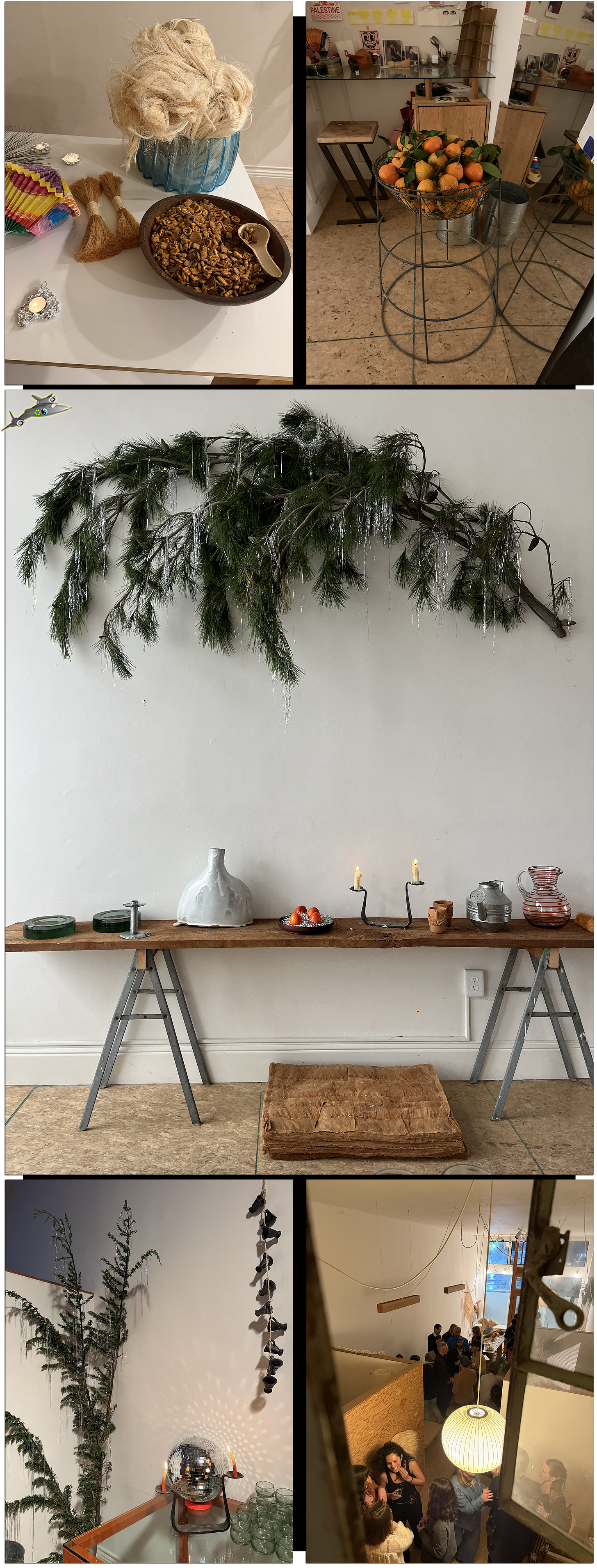 Erin threw a holiday party earlier this month with our friends Kelsey and Tessa, here in Oakland at Tessa’s gallery. They hung garlanded boughs of pine from the walls, filled up a wire basket with satsumas, built a pyramid of Ricciarelli (possibly Earth’s Greatest Cookies), dumped a kiloton of Chex Mix into a large bowl, filled steel tubs with cold beverages, and lit a flotilla of candles, with votives wrapped in tin foil and tapers perched before a disco ball.