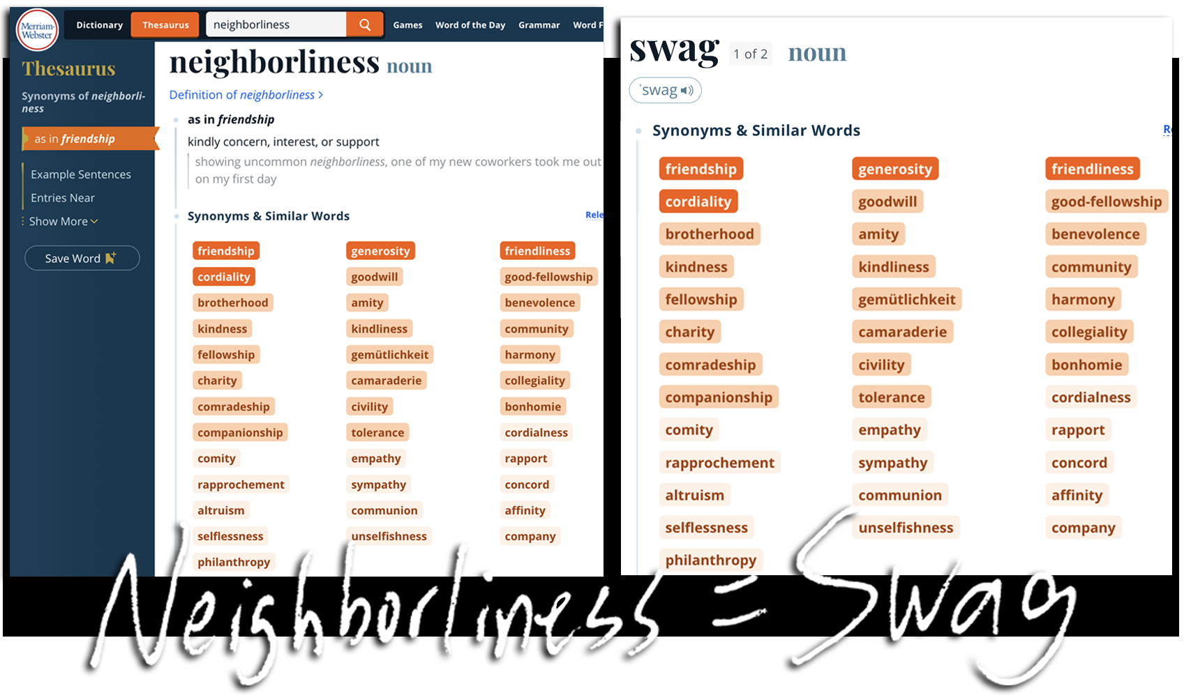 And neighborhoods are very tight, to the degree that, if someone asked us, “Erin and Jonah, when you cut through all the idiot chatter of these topsy-turvy modern times, what is the underlying secret to true swag?” we’d be hard pressed to give you a better, more eternally resonant, and more concise answer than neighborliness.